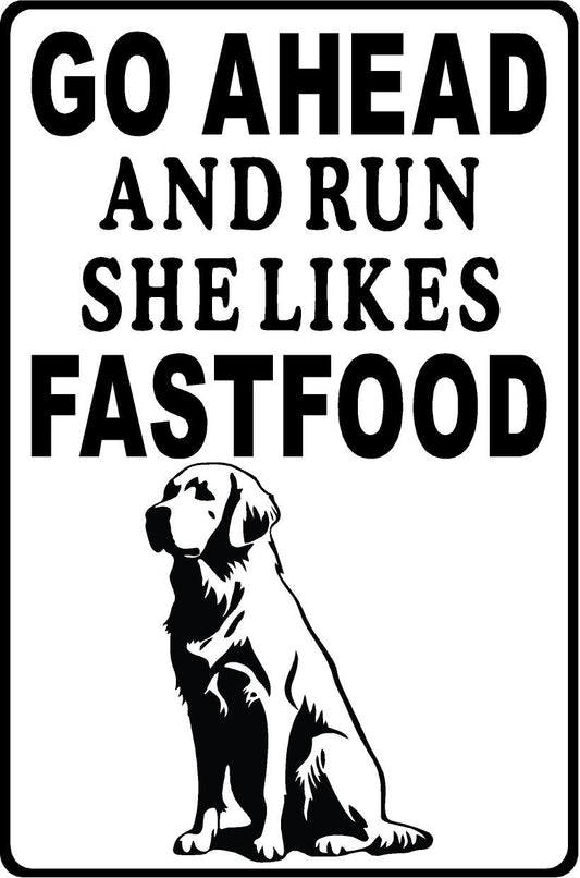 Golden Retriever Metal sign Go Ahead and Run He Likes Fast Food (Personalized)