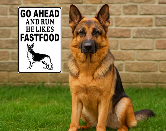 German Shepherd Metal sign Go Ahead and Run He Likes FastFood (Personalized)